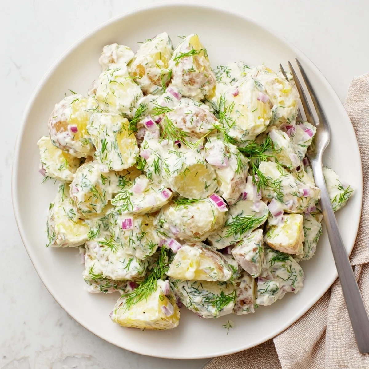 This lighter take on the classic side dish swaps heavy mayonnaise for tangy Greek yogurt, creating a creamy base that perfectly coats tender baby potatoes. The dressing gets zipped up with Dijon mustard and apple cider vinegar, while fresh dill, parsley, and chives add bright herbal notes. Crunchy celery and red onion provide texture contrast, making each bite satisfying and refreshing.