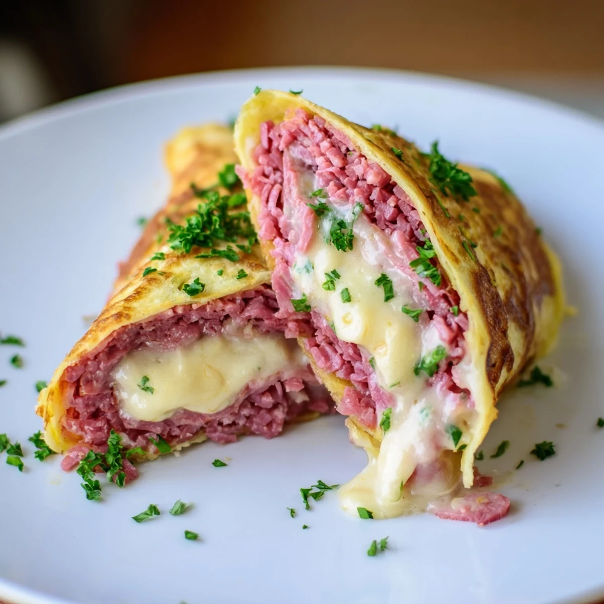 The egg wraps are surprisingly simple to master—just whisk eggs with cream, pour into a hot skillet, and cook until set into thin crepes. Each wrap gets filled with the classic Reuben trio: corned beef, sauerkraut, and Swiss, then rolled tight and briefly returned to the pan to melt the cheese. The result is a warm, handheld meal that delivers protein and flavor without the bread.