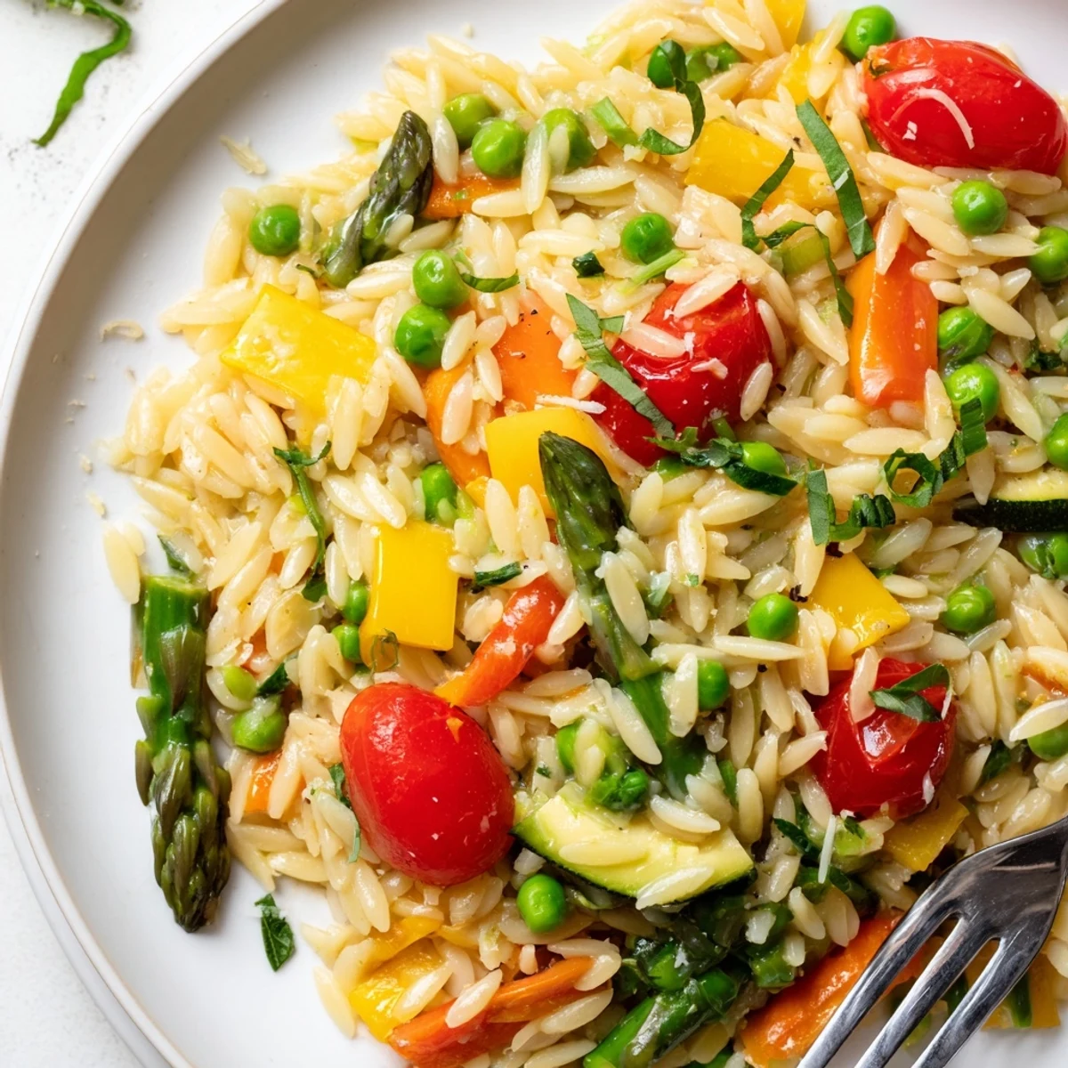 This vibrant Italian-inspired dish combines tender orzo pasta with a colorful medley of fresh spring vegetables. The orzo is cooked until perfectly al dente, then tossed with sautéed zucchini, sweet cherry tomatoes, crisp bell pepper, tender asparagus, and sweet peas.