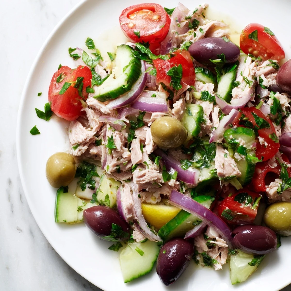 This vibrant Mediterranean-inspired tuna salad comes together in just 15 minutes with no cooking required. Flaky tuna in olive oil pairs beautifully with crisp cherry tomatoes, refreshing cucumber, thinly sliced red onion, and sweet roasted red peppers.