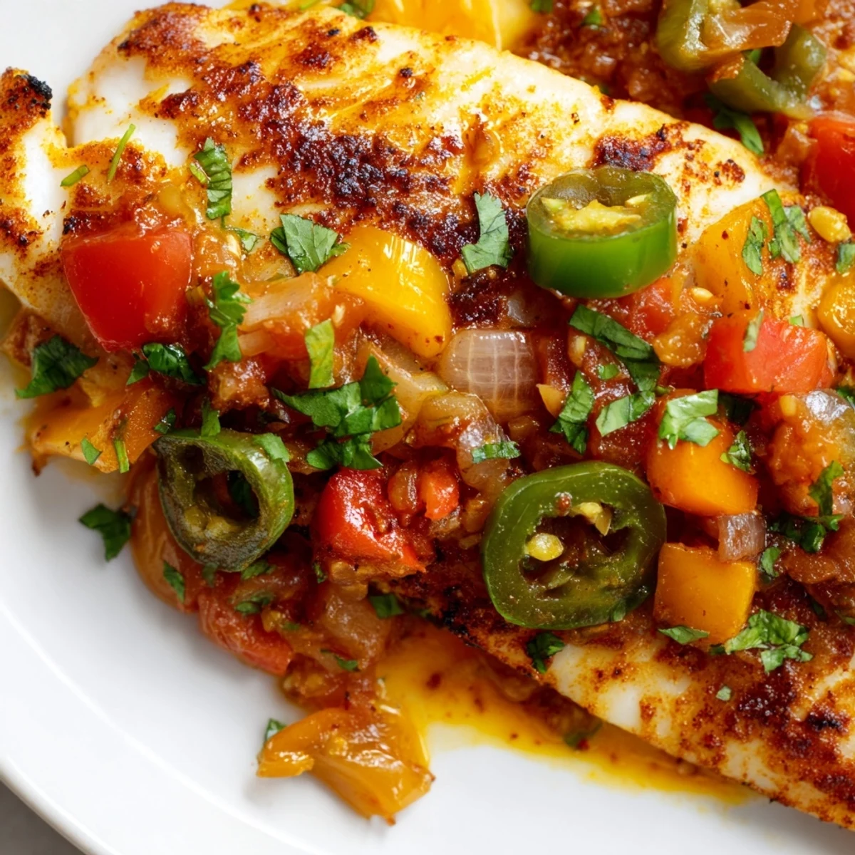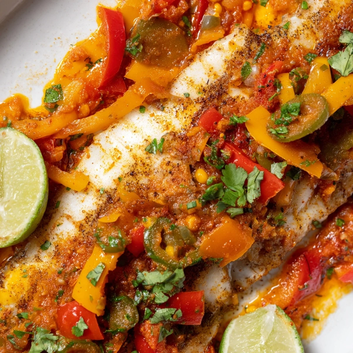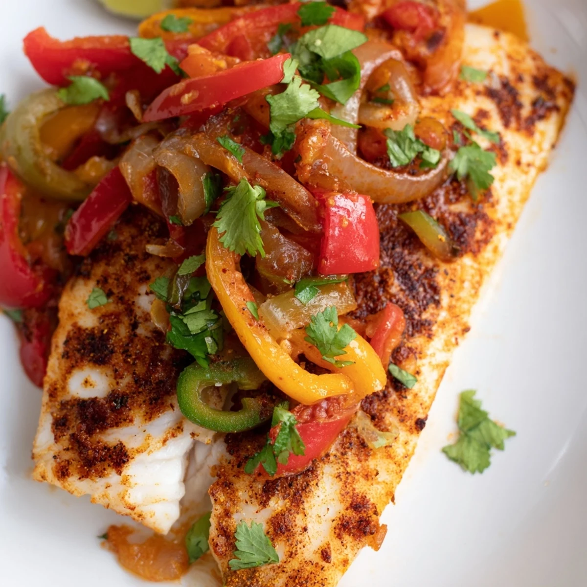 This one-pan tilapia brings together mild white fish with a colorful medley of roasted red and yellow bell peppers, jalapeño slices, and aromatic spices. The fish sears quickly to golden perfection, then simmers in a smoky tomato-based sauce infused with smoked paprika, cumin, and chili flakes. A finish of fresh lime juice and cilantro brightens every bite.